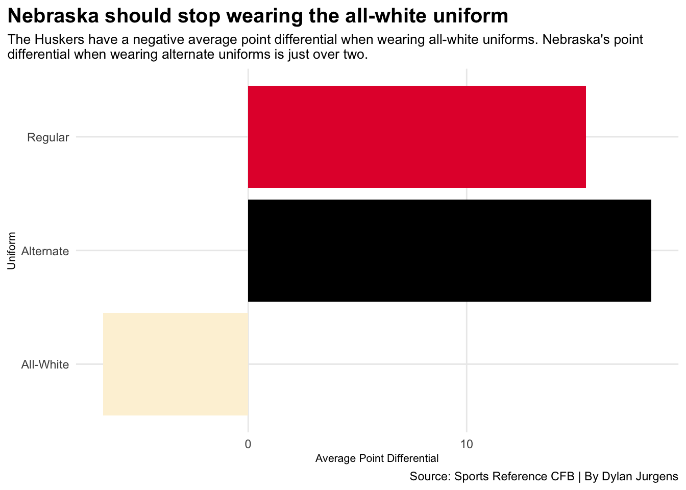 updatedregular <- Updated_Alternate_Uniforms |>filter(Uniforms=="Regular") |>summarise(avg_pd =mean(pd) ) |>mutate(Uniforms ="Regular" )updatedallwhite <- Updated_Alternate_Uniforms |>filter(Uniforms=="All-White") |>summarise(avg_pd =mean(pd) ) |>mutate(Uniforms ="All-White" )updatedalternate <- Updated_Alternate_Uniforms |>filter(Uniforms=="Alternate") |>select(Uniforms, pd) |>summarise(avg_pd =mean(pd) ) |>mutate(Uniforms ="Alternate" )ggplot() +geom_bar(data=updatedregular, aes(x=Uniforms, weight=avg_pd), fill="#E41C38") +geom_bar(data=updatedallwhite, aes(x=Uniforms, weight=avg_pd), fill="#FDF2D9") +geom_bar(data=updatedalternate, aes(x=Uniforms, weight=avg_pd), fill="#000000") +coord_flip() +labs(x="Uniform",y="Average Point Differential",title="Nebraska should stop wearing the all-white uniform",subtitle="The Huskers have a negative average point differential when wearing all-white uniforms. Nebraska's point \ndifferential when wearing alternate uniforms is just over two.",caption="Source: Sports Reference CFB | By Dylan Jurgens" ) +theme_minimal() +theme(plot.title =element_text(size =15, face ="bold"),axis.title =element_text(size =8),plot.subtitle =element_text(size=10),panel.grid.minor =element_blank(),plot.title.position ="plot" )