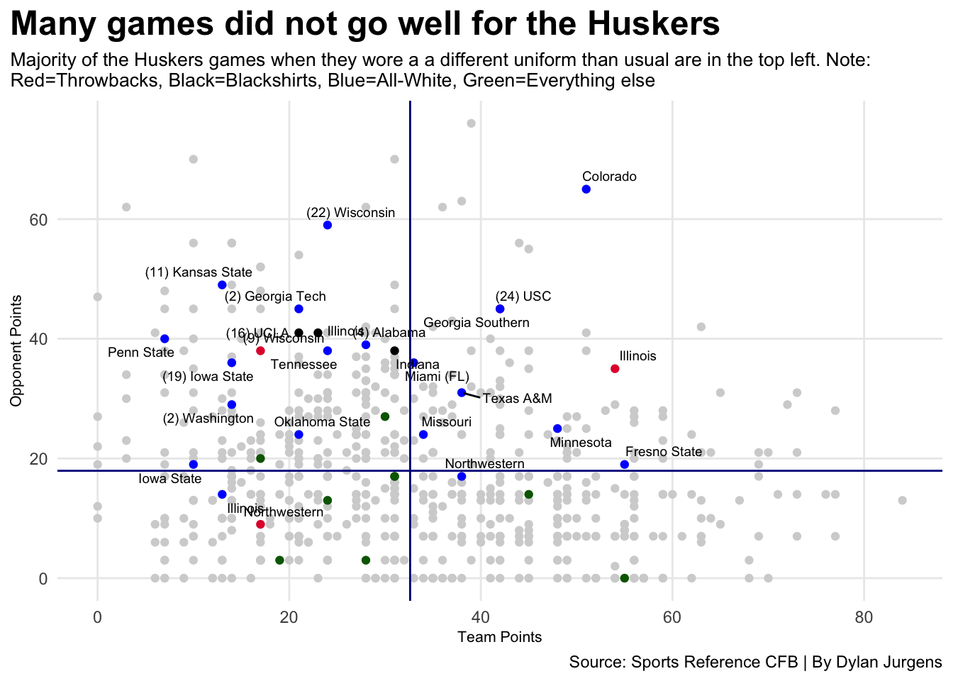 Throwbacks <- Updated_Alternate_Uniforms |>filter( Uniforms =="Throwbacks" )Blackshirts <- Updated_Alternate_Uniforms |>filter( Uniforms =="Blackshirts" )all_white <- Updated_Alternate_Uniforms |>filter( Uniforms =="All-White" )everythingelse <- Updated_Alternate_Uniforms |>filter( Uniforms =="Alternate" )ggplot() +geom_point(data=Updated_Alternate_Uniforms, aes(x=Pts, y=Opp), color="lightgrey") +geom_point(data=Throwbacks, aes(x=Pts, y=Opp), color="#E41C38") +geom_point(data=Blackshirts, aes(x=Pts, y=Opp), color="#000000") +geom_point(data=all_white, aes(x=Pts, y=Opp), color="blue") +geom_point(data=everythingelse, aes(x=Pts, y=Opp), color="darkgreen") +geom_text_repel(data=Throwbacks, aes(x=Pts, y=Opp, label=Opponent), size=2.5) +geom_text_repel(data=Blackshirts, aes(x=Pts, y=Opp, label=Opponent), size=2.5) +geom_text_repel(data=all_white, aes(x=Pts, y=Opp, label=Opponent), size=2.5) +geom_vline(xintercept =32.61711 , color="darkblue") +geom_hline(yintercept =17.9425 , color="darkblue") +labs(x ="Team Points",y ="Opponent Points",title ="Many games did not go well for the Huskers",subtitle ="Majority of the Huskers games when they wore a a different uniform than usual are in the top left. Note:\nRed=Throwbacks, Black=Blackshirts, Blue=All-White, Green=Everything else",caption ="Source: Sports Reference CFB | By Dylan Jurgens" ) +theme_minimal() +theme(plot.title =element_text(size =18, face ="bold"),axis.title =element_text(size =8),plot.subtitle =element_text(size =10),panel.grid.minor =element_blank(),plot.title.position ="plot" )